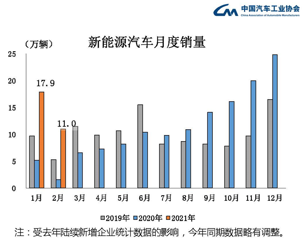 商用車(chē)同比增速低于乘用車(chē) 2月,商用車(chē)產(chǎn)銷(xiāo)分別完成34萬(wàn)輛和29.9萬(wàn)輛,環(huán)比分別下降28.8%和34.8%,同比分別增長(zhǎng)2.8倍和2.5倍,低于乘用車(chē)增速。1-2月,商用車(chē)產(chǎn)銷(xiāo)分別完成81.8萬(wàn)輛和75.7萬(wàn)輛,同比分別增長(zhǎng)96.3%和86.2%。 新能源汽車(chē)?yán)^續(xù)刷新當(dāng)月歷史產(chǎn)銷(xiāo)記錄 2月,新能源汽車(chē)產(chǎn)銷(xiāo)分別完成12.4萬(wàn)輛和11萬(wàn)輛,同比分別增長(zhǎng)7.2倍和5.8倍,本月新能源汽車(chē)已連續(xù)8個(gè)月刷新當(dāng)月產(chǎn)銷(xiāo)歷史記錄。1-2月,新能源汽車(chē)產(chǎn)銷(xiāo)分別完成31.7萬(wàn)輛和28.9萬(wàn)輛,同比分別增長(zhǎng)3.9倍和3.2倍。