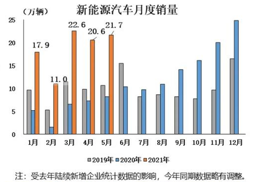 商用車產銷同比下降明顯。 5月,商用車產銷分別完成42.4萬輛和48.2萬輛,環比分別下降18.6%和12.1%;同比分別下降19.6%和7.4%。1-5月,商用車產銷分別完成234.1萬輛和243.8萬輛,同比分別增長27.8%和31.9%,增幅比1-4月分別回落19.2和15.4個百分點。 新能源汽車繼續刷新當月產銷歷史記錄。 5月,新能源汽車產銷均完成21.7萬輛,同比分別增長1.5倍和1.6倍,繼續刷新當月產銷歷史記錄。1-5月,新能源汽車產銷分別完成96.7萬輛和95萬輛,同比均增長2.2倍。