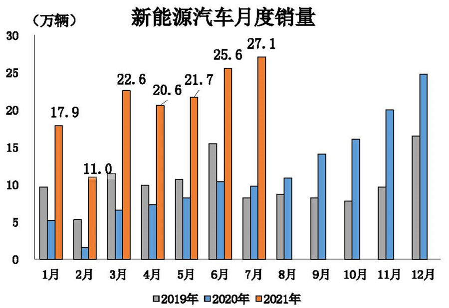 新能源汽車產銷繼續刷新歷史記錄 7月,新能源汽車產銷分別完成28.4萬輛和27.1萬輛,同比分別增長1.7倍和1.6倍。1-7月,新能源汽車產銷分別完成150.4萬輛和147.8萬輛,同比均增長2倍。