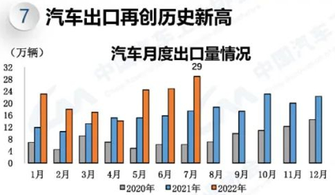 汽車出口再創歷史新高 7月,汽車企業出口29萬輛,連續創歷史新高,出口量環比增長16.5%,同比增長67%。1-7月,汽車企業出口150.9萬輛,同比增長50.6%,全年出口將有望超過240萬輛,符合年初預期。