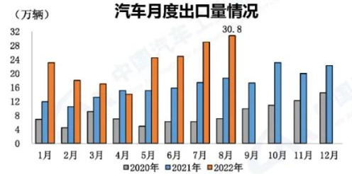 汽車出口再創(chuàng)歷史新高 8月,汽車企業(yè)出口達(dá)30.8萬輛,連續(xù)創(chuàng)歷史新高,實(shí)現(xiàn)首次單月出口超30萬輛,環(huán)比增長(zhǎng)6.2%,同比增長(zhǎng)65%。其中,新能源車出口8.3萬輛,環(huán)比增長(zhǎng)53.6%,同比增長(zhǎng)82.3%,呈高速增長(zhǎng)勢(shì)頭。1-8月,汽車企業(yè)出口181.7萬輛,同比增長(zhǎng)52.8%。其中,新能源汽車出口34萬輛,同比增長(zhǎng)97.4%。