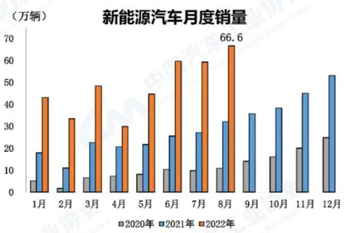 新能源汽車產(chǎn)銷繼續(xù)保持增長(zhǎng)勢(shì)頭 8月,新能源汽車產(chǎn)銷分別完成69.1萬輛和66.6萬輛,月度產(chǎn)銷再創(chuàng)歷史新高,產(chǎn)銷同比分別增長(zhǎng)1.2倍和1倍。1-8月,新能源汽車產(chǎn)銷分別完成397萬輛和386萬輛,同比分別增長(zhǎng)1.2倍和1.1倍。