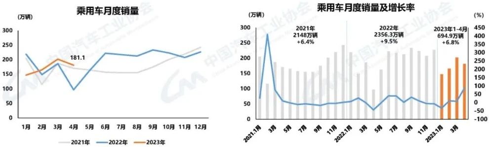 ![]() 昨日(5月11日),中國汽車工業協會(簡稱“中汽協”)發布4月汽車行業經濟情況。2023年4月,汽車產銷分別完成213.3萬輛和215.9萬輛,同比分別增長76.8%和82.7%。其中,新能源汽車產銷分別完成64萬輛和63.6萬輛,同比均增長1.1倍。 中汽協表示,4月因去年同期低基數效應影響,汽車市場產銷實現同比大幅增長。其中,新能源汽車產銷和汽車出口繼續延續良好態勢。同時也要看到,由于3月以來的非理性促銷潮造成消費者持幣觀望,汽車消費尚處于緩慢恢復過程中,加之商用車行業復蘇速度不及預期,在諸多不利影響下,4月產銷較3月有所下降。 汽車產銷同比大幅增長 4月,汽車產銷分別完成213.3萬輛和215.9萬輛,環比分別下降17.5%和11.9%,同比分別增長76.8%和82.7%。1-4月,汽車產銷分別完成835.5萬輛和823.5萬輛,同比分別增長8.6%和7.1%。同比去年同期的產銷下跌,今年累計產銷實現由負轉正。