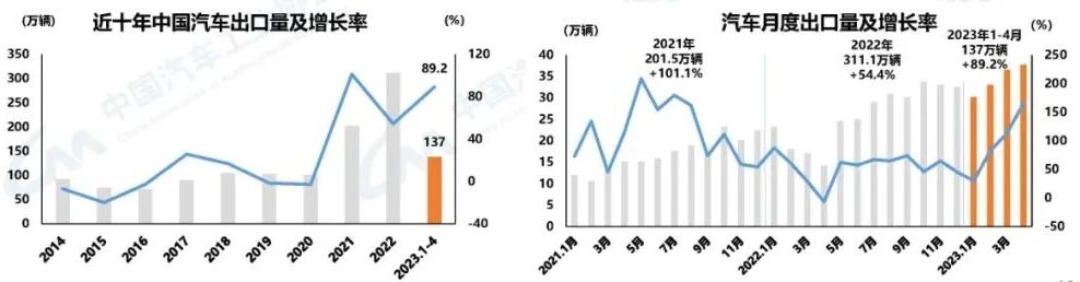 汽車出口持續迅猛增長 4月,汽車企業出口37.6萬輛,環比增長3.3%,同比增長1.7倍。1-4月,汽車企業出口137萬輛,同比增長89.2%。