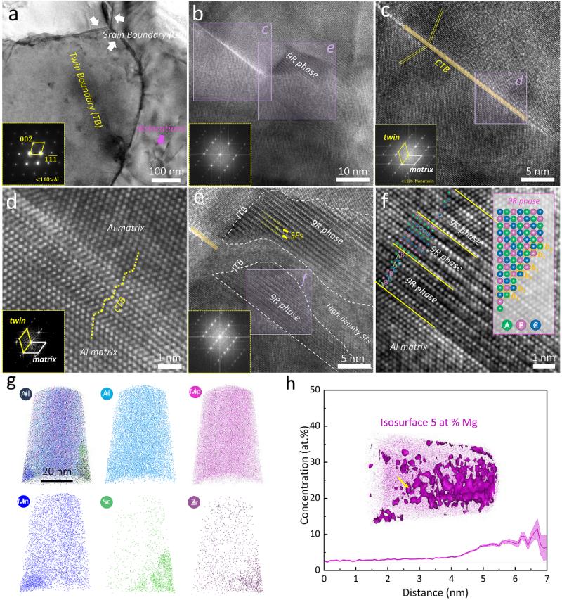 圖1 打印態鋁合金中具有三模態晶粒分布的分級異質結構圖 針對上述問題,朱強與其合作者提出了一種通過增材制造技術制備具有超細異質結構與納米尺度面缺陷強化的Al-Mg-Mn-Sc-Zr合金材料,其兼具超高強度與高塑性。研究表明打印態鋁合金展示出三模態晶粒分布的分層異質結構:超細等軸晶,細等軸晶與細小柱狀晶,主要是由于Al3(Sc,Zr)顆粒的不均勻析出而形成。進一步的微觀組織表征還發現納米尺度的面缺陷,包括高密度的層錯、孿晶界與9R相。打印態的合金展示出優異的力學性能,包括屈服強度~461 MPa,延伸率~21%。為進一步增幅沉淀強化效果,課題組采用直接時效熱處理(300攝氏度下4小時)促進大量納米強化相的析出。同時,打印態組織中的納米級面缺陷和三模態晶粒異質結構在熱處理后也得以保留,這成就了超高強度與優異塑性的結合。熱處理態合金~656MPa的屈服強度超過了之前報道的幾乎所有增材制造高強鋁合金與鍛造鋁合金。