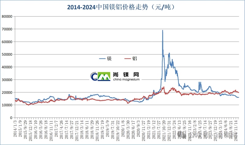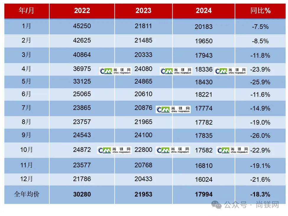 ![]() 2024年中國鎂錠價格一路下行,從年初的20200元/噸,下跌至年底的16000元/噸,16000元成為重要的價格支撐線。2024年底的鎂價格已經(jīng)跌回到2021年4月水平,為44個月來最低值。2024年鎂價格月度平均值從1月份的20183元/噸,跌至12月份的16024元/噸。2024全年平均價格為17994元/噸,與2023年同比下降了18.0%,為4年最低值。年內(nèi)價格凈跌去4200元,跌幅20.8%。 受鎂主產(chǎn)地榆林地區(qū)能耗雙控和環(huán)保整改影響,2021年9月中下旬開始的一輪鎂價格上漲周期大體上持續(xù)了8個月。隨著榆林地區(qū)鎂廠環(huán)保改造逐步完成,鎂生產(chǎn)和供求關(guān)系有了很大的改善,自2022年4月起,鎂價格進(jìn)入下降通道,鎂生產(chǎn)企業(yè)再陷入經(jīng)營困難時期。在成本因素支撐下,2022年下半年及2023年全年,鎂價格還能在20000-26000元之間波動,一直在20000元以上堅(jiān)守。但是,進(jìn)入2024年,由于鎂廠改造和生產(chǎn)的全面恢復(fù),鎂供應(yīng)量進(jìn)一步增加,但是消費(fèi)端并沒有同步跟進(jìn),鎂價在2月份就跌破20000元,其中二、三月和4季度跌幅最大。由于商業(yè)收儲行動和季節(jié)性采購因素,第二、三季度價格有所反彈并有所維穩(wěn),但是11月份之后價格再度急劇下行。全年鎂價凈跌去4200元,跌幅20.8%。 2024年年初價格:20200元(1月2日) 2024年年末價:16000元(12月30日) 最低價:16000元(12月30日) 最高價:20400元(1月19日) 年度平均價:17994元 2022-2024年中國鎂錠月度平均價(元/噸)