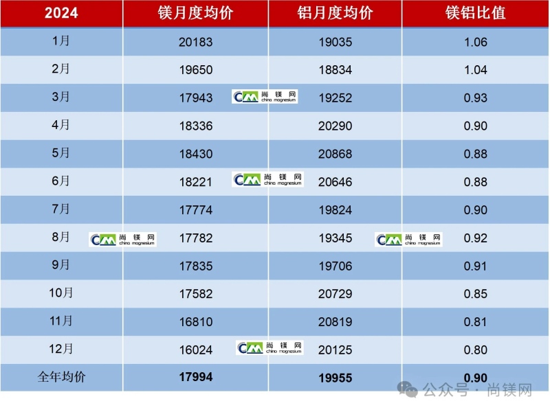 可以說,目前鎂價已經(jīng)超跌,鎂鋁比值已經(jīng)低于公認(rèn)的合理區(qū)間,鎂冶煉廠普遍處于虧損狀態(tài)。但是另一方面,鎂鋁比值的回歸,鎂的性價比再度凸顯,是有利于鎂合金應(yīng)用的重要信號。2025年,預(yù)計(jì)鎂鋁比值仍然會保持在合理區(qū)間,相關(guān)產(chǎn)業(yè)鏈人士應(yīng)該重新樹立鎂市場穩(wěn)定供應(yīng)的信心。 2024年中國鎂錠與鋁錠月度平均價及鋁鎂比值(元/噸)