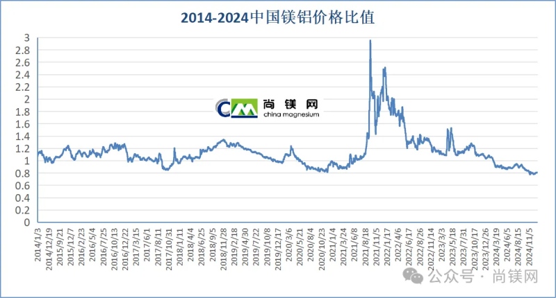 在2024年3月4日,國內(nèi)鎂價格開始低于鋁價,其后鎂鋁價格走勢完全相反,鎂跌鋁漲,價差開始逐步拉大,鎂鋁比值持續(xù)下降。全年的近10個月時間里,鎂價格與鋁價格的比值都在1.0以下,11月中旬最低達(dá)到過0.78,當(dāng)時鎂價低于鋁價4880元。年底收盤時鎂鋁比值為0.81,鎂價顯著低于鋁價3760元。