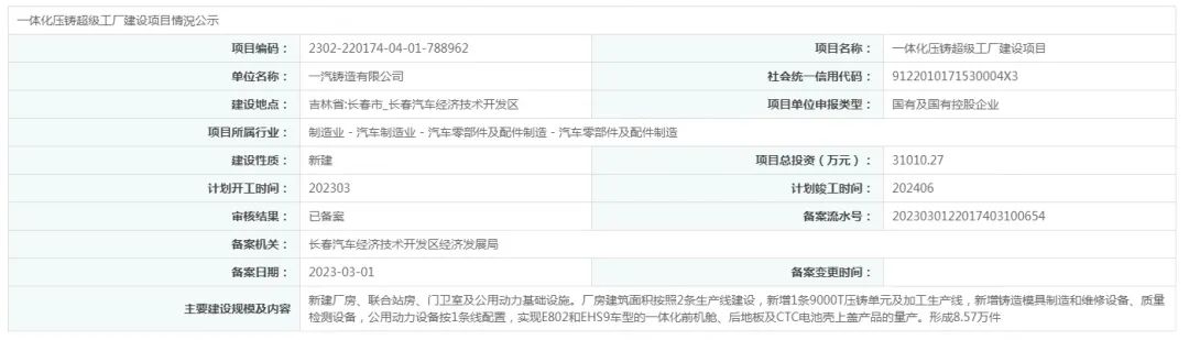 ![]() 一汽鑄造擬新建一體化壓鑄工廠 近日(3月1日),長春汽車經(jīng)濟技術(shù)開發(fā)區(qū)經(jīng)濟發(fā)展局發(fā)布一體化壓鑄超級工廠建設(shè)項目備案公示。該項目由一汽鑄造有限公司投資建設(shè),主要建設(shè)內(nèi)容為新建廠房、聯(lián)合站房、公用動力基礎(chǔ)設(shè)施等。