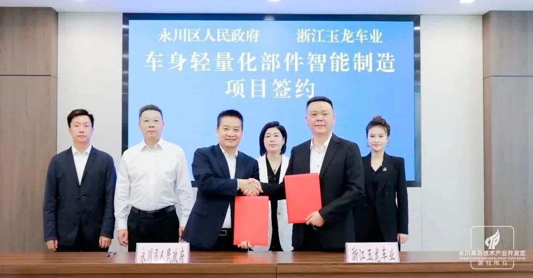 浙江玉龍車業在重慶投建壓鑄項目 來自永川高新區消息,日前(5月9日),重慶永川區人民政府與浙江玉龍車業有限公司簽訂合作協議,共建車身輕量化部件智能制造生產項目。據悉,該項目一期占地面積52畝,將購置壓鑄機、加工中心等生產設備。
