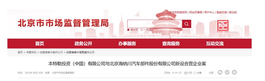 日前(6月29日),北京市市場監管局網站發布消息,本特勒投資(中國)有限公司(“本特勒”)與北京海納川汽車部件股份有限公司(“海納川”)簽署協議擬于中國北京市共同出資設立兩家合資經營企業。兩家合營企業擬主要從事乘用車底盤模塊業務。
