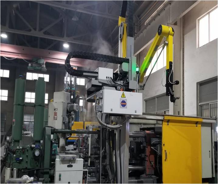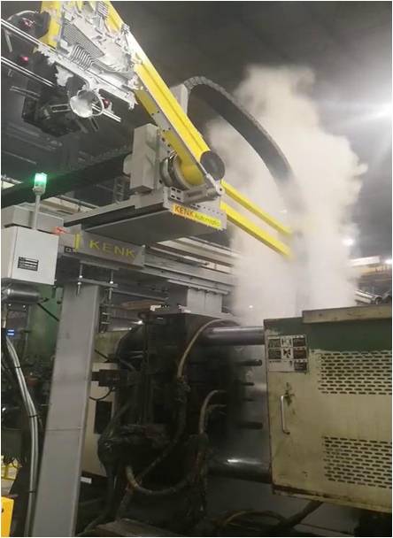 圖2:KRES系列噴取一體機在客戶工廠應用 同樣由于Z軸采用了連桿機構,產品取出后直接被送至壓鑄機安全門以外的地方待機,這時噴霧產生的高溫高濕的氣體不會對鑄件質量產生影響(見下圖2)。此外,高強度的連桿手臂可在后期實現多功能的拓展,例如:可實現鑄件水冷,去渣包,切邊等功能。