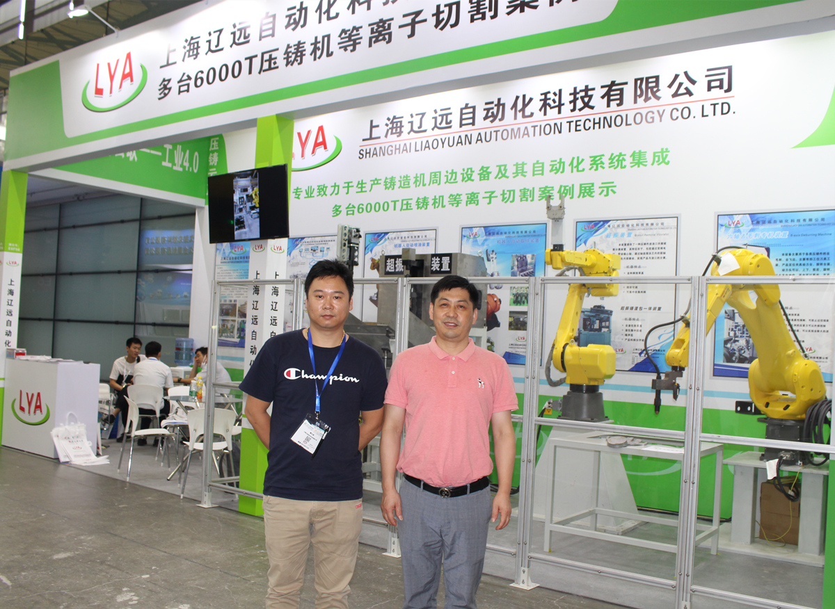 上海遼遠總經理胡培民先生(右)與公司技術工程師 在日前落幕的“2021上海國際壓鑄展”上,上海遼遠自動化科技有限公司(“遼遠自動化”)現場展示了超振裝置實物、六軸取件機器人以及六軸等離子切割裝置,滿足了壓鑄企業(yè)壓鑄自動化設備多樣化的需求。