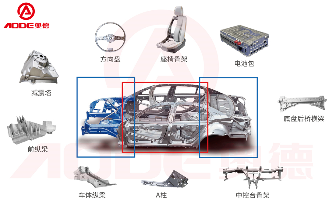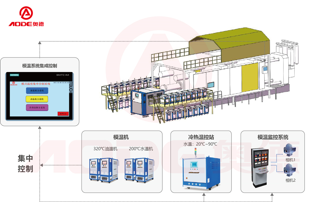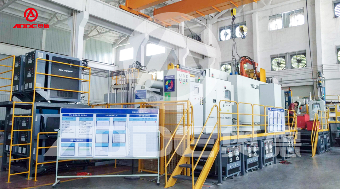 ![]() 結(jié)構(gòu)件在車身中的應用 奧德于2020年初應客戶需求開發(fā)出大型汽車結(jié)構(gòu)件一體化壓鑄智能溫控系統(tǒng)。經(jīng)過一年多的市場推廣至今,奧德已為知名新能源汽車企業(yè)交付數(shù)套并投入使用。下文為大家分享大型汽車結(jié)構(gòu)件一體化壓鑄智能溫控系統(tǒng)的原理及解決方案。 隨著零排放、輕量化成為全球汽車工業(yè)的發(fā)展趨勢,同時也是節(jié)能減排的重要途徑,加上中國新能源汽車市場的迅猛發(fā)展,大型汽車壓鑄結(jié)構(gòu)件對模溫平衡的需求顯而易見。汽車輕量化主要分為材質(zhì)輕量化和結(jié)構(gòu)輕量化,考慮到成本、生產(chǎn)難度等因素,鋁合金和結(jié)構(gòu)件壓鑄是首選材料和最優(yōu)工藝。當汽車結(jié)構(gòu)件改用大型輕合金薄壁鑄件時,一方面可有效實現(xiàn)輕量化;另一方面,由于結(jié)構(gòu)高度集成、一體成形,從而減少了成型和連接環(huán)節(jié),精簡了工藝,進而降低了成本。 大型汽車結(jié)構(gòu)件一體化壓鑄過程中的溫度控制是關(guān)鍵環(huán)節(jié),溫度控制包括模具、壓室與沖頭、分流錐與澆口套等溫度平衡控制。模溫控制系統(tǒng)是通過模溫機單元連續(xù)工作控制動定模、模肉和模架的溫度,利用常壓冷卻裝置的連續(xù)工作控制壓室、沖頭分流錐和澆口套的溫度,采用高壓模冷機斷續(xù)工作控制模芯、模塊溫度,通過細芯點冷機斷續(xù)工作控制型芯銷、小鑲塊溫度。 其中,模溫機是用來調(diào)節(jié)模具溫度的平衡,可以升溫也可以降溫。模溫機利用高熱傳性的導熱媒體,以便在很短的時間內(nèi)將模具內(nèi)溫度提高或者將多余的熱送走。在設定好熱平衡溫度后,能將其溫度自動控制在極小的誤差之內(nèi),且能維持定值。利用模溫機調(diào)節(jié)模具的平衡溫度,可以預熱模具的生產(chǎn)溫度,優(yōu)化循環(huán)時間,更好地促進產(chǎn)品定型,減少開機時保證絕大部分的次品率。
