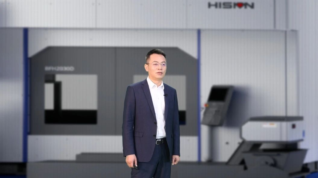海天精工副總經理林洪然先生 發布會中,海天精工副總經理林洪然帶領觀眾領略了BFH2030D雙五軸高速銑削中心的非凡性能。這款機器配備三通道獨立運行的數控系統,不僅做到11軸同步運行,甚至實現了加工區域以外其它輔助動作的同步,比如伺服驅動的刀庫,上下料伺服自動門等。 直線軸全部采用直線電機驅動,旋轉軸全部采用力矩電機直驅,搭配高速電主軸及合理的拖鏈、管路布局,可實現高速運動,確保長期運行的穩定性。除此之外,換刀也同樣迅速,削對削僅需5秒。斷刀檢測裝置的配備可實現真正的刀具斷裂的閉環監控。