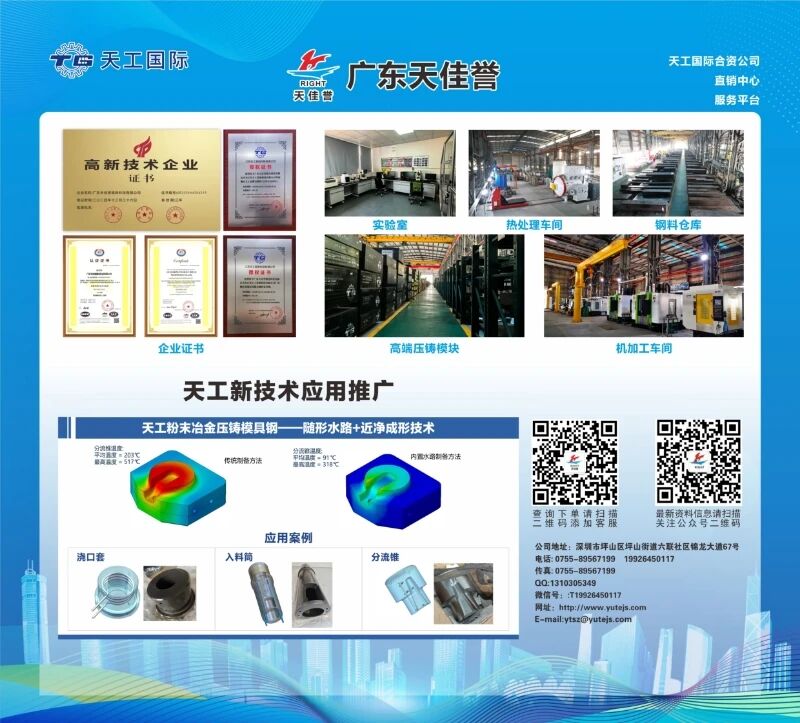 2025年由天工國際牽頭,聯合清華大學、寧德時代等八家單位共同參與國家重點研發項目-“新型壓鑄模具用鋼粉末冶金與增材制造關鍵技術研發與應用”,其中“天工粉末冶金壓鑄模具鋼-近凈成型+隨形冷卻技術”是該項目的重點內容之一。天佳譽作為天工國際的市場前沿肩負起了該技術在廣東地區的推廣應用。 在壓鑄生產中,料筒負責儲存、加熱并輸送金屬熔液;澆口套、分流錐作為料筒與模具的連接接口,引導熔液高效進入模具;分流錐實現熔液的均勻分流,避免渦流產生;沖頭則推動熔液完成注射填充;模具實現金屬液成型,通過模具的密封和導向,讓高溫金屬液在壓力下充滿型腔并冷卻凝固。這些部件及模具系壓鑄機澆注系統的關鍵組成部分,其質量直接關系到金屬熔液的輸送穩定性、填充均勻性與成型效率,進而影響壓鑄件的尺寸精度、內部致密度與表面質量。 廣東天佳譽模具科技有限公司(簡稱“廣東天佳譽”)總經理鄧志斌表示:“作為壓鑄機的主要損耗品,這些部件長期接觸高溫高壓的金屬熔液,會受到腐蝕、沖刷和熱疲勞作用等因素影響,進而影響生產效率和使用壽命。不過,通過“天工粉末冶金壓鑄模具鋼-近凈成型+隨形冷卻技術”的運用,不僅能提高產品性能,還能大幅提高水路冷卻效果,實現高效生產,降低能耗,提升生產價值。” 近日,“2025國際(深圳)鑄業展”在深圳國際會展中心成功舉辦。廣東天佳譽憑借其創新新技術產品“天工粉末冶金壓鑄模具鋼-近凈成形+隨形冷卻技術”成為展會焦點之一。該技術突破了傳統工藝局限,為壓鑄機及模具配件耗材提供了全新制造解決方案。