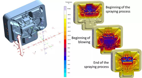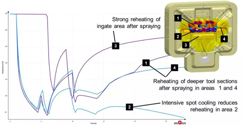 圖11:表面附近模具區域的溫度曲線說明了噴涂工藝與內部模具溫度控制相結合的有效性。區域2中的內部點冷卻從模具中局部提取能量,并將模具表面的再加熱水平降至最低。