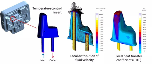 圖13:冷卻管路中的不同流動情況及其局部傳熱。考慮冷卻介質在管路里流動可使鑲件頂端冷卻能力提高成為可能。