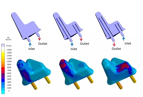 這些擴展的工藝知識允許對各種冷卻管路進行系統、自動化的評估和優化。要分析的可能目標包括改善鑄件質量、影響工藝時間(循環時間)的工藝條件,以及模具腐蝕減少和能量平衡評估。在該背景下,可能的自由度可以是幾何形狀、模具中冷卻管路位置以及所有工藝條件的變化。圖13以傳熱系數為例,示出了冷卻管路中不同流動情況對局部冷卻能力分布的影響。流動傳導冷卻管路的使用可使鑲件頂端冷卻能力效果增加。