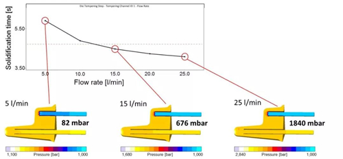 圖14:冷卻管路的主效果圖,涉及不同流速對關鍵鑄造區域局部凝固時間的影響。隨著流速的增加,系統中的壓力損失導致能量效率越來越低。