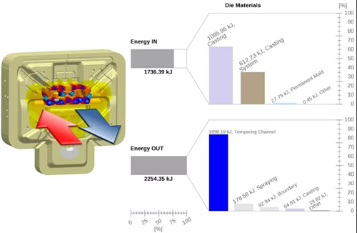 模具的熱平衡以及整個系統的熱穩定性可以用MAGMASOFT®5.4中集成的能量平衡來評估,參見圖15。直觀的概述允許分析和評估所有材料/材料組(例如鑄件、鑄造系統、模具的一部分)在整個工藝周期、各個工藝階段或規定時間段內的能量交換。例如,可以直接比較和優化排放的能量,同時考慮通過內部冷卻和外部噴涂在工藝循環過程中的成本效率。