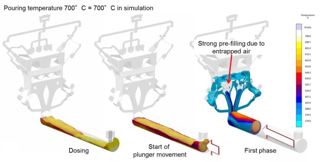 圖4:考慮壓射室的接頭模具充型分析。在沖頭運(yùn)動(dòng)的第一階段,所選擇的壓射曲線導(dǎo)致大量的卷氣和金屬液的顯著溫度損失。