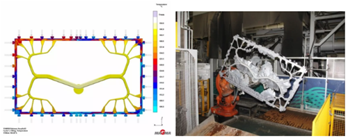 初始設計的變形分析(放大20倍;左:垂直,右:水平) 高壓壓鑄工藝本身的布局要求尤為苛刻。早期就必須得出針對設計和鑄件參數可能組合的可比較和可靠的結果。DGS的項目管理領導者 Axel Schmidt記得那些最關鍵的問題:“該鑄件數米長的流動長度能夠被完全填充嗎?完全填充需要多長填充時間?如果充型金屬流前端在金屬流動2到3米后再匯聚會發生什么?我們必須在早期就回答這些問題,以研究出節約成本和有效利用資源的方法,引導項目獲得成功”。開始階段,開發出采用兩個澆口區域的設計方案,并采用MAGMASOFT®進行了評估,考察了諸如“流動長度”、“充型溫度”和“材料追蹤”等不同的質量標準。正如結果所示,解決框架變形問題是最具挑戰性的任務。 第一次模擬結果表明,在采用初始澆口設計方案的情況下,框架縱向變形最大9毫米,橫向變形最大為5毫米 ——該結果遠遠滿足不了客戶的要求。形勢非常嚴峻, DGS團隊的唯一選擇只能是重新設計澆注系統。專家再一次采用 MAGMASOFT®進一步核查了基于經驗的選項。按照DGS的經驗,MAGMASOFT®是他們項目滿足交貨時間,同時確保生產工藝成功的關鍵因素。 最終他們成功找到了解決方案:即設計出在四個角設置內澆口(內澆口數量合計為20個)的一套澆注系統。Axel Schmidt 簡要概括道:“要設計出框架變形最小的設計方案,MAGMASOFT®發揮了關鍵作用。快速并及早測出不同的變化是非常有必要的,這使得我們能夠采用合適方法設計澆注系統,使其對鑄件施加的應力盡可能降低到最小。采用該方法,我們可以完全避免任何重大變形,同時盡量減少其它鑄造缺陷。‘材料追蹤’結果使得我們可以檢查金屬流的均衡流動。當然,‘變形’結果被用于極為詳細地分析零件的變形,并記錄和討論每個設計修改的效果。” 接下來,修正后的鑄造工藝方案將應用到實際生產中。鑲件和冷卻管路的設計和布局是未定的重大任務。DGS團隊再一次采用MAGMASOFT® 制定出10倍分隔后的壓鑄模半模的冷卻方案。兩個半模重量為14.1噸和20.3噸,最終確定鑄件的特殊尺寸和冷卻要求。最后,模型設計完成,并及時投入鑄造和生產。如今,他們的產品是兩個主要太陽能集能器制造商必不可少的部分。