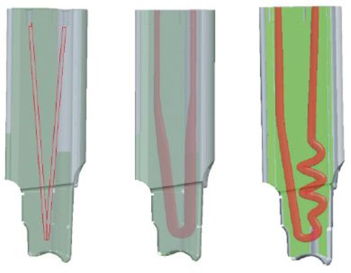 不同的冷卻通道的設計:CNC傳統鑲塊(左),3D打印鑲塊(右) 即使隨著鑲塊的逐漸老化(界面傳熱系數降低),3D打印鑲塊的溫度都比傳統鑲塊的低了近50℃。這說明3D打印的冷卻效果要好很多。