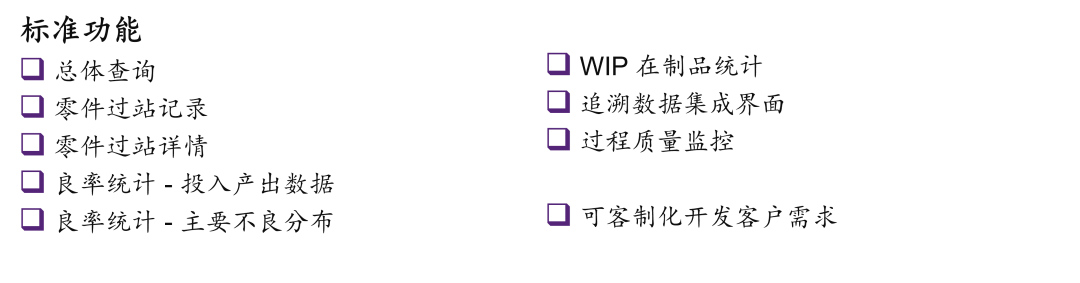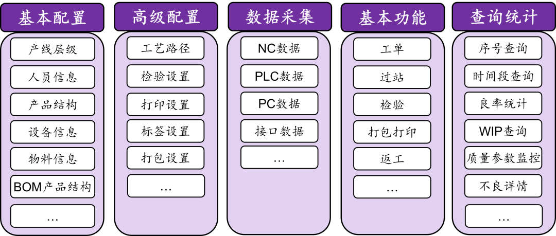 •制造執(zhí)行系統(tǒng)(MES),包括:生產(chǎn)管理(PMS)、設(shè)備管理(TPM)、追溯管理(TMS)、刀具管理(TLM)、模具管理(DLM)及倉(cāng)儲(chǔ)管理(WMS)等,