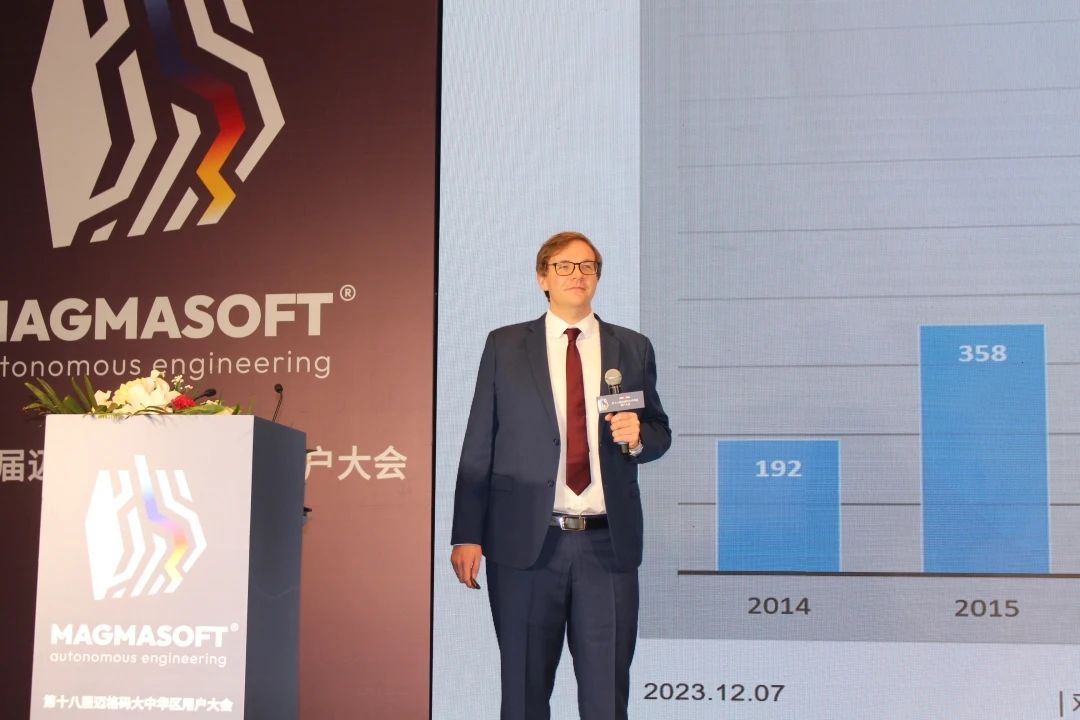接著,大會正式進入大會主要環節——用戶案例報告分享和MAGMASOFT®新功能新應用介紹,重慶三友機器制造有限責任公司李宗科先生以《基于MAGMASOFT®的工藝方案改善》為題作報告;諾瑪科(南京)汽車零部件有限公司胡偉華先生以《MAGMASOFT®在GSPM缸蓋產品氣泡問題上的成功應用》為題作報告;奇瑞新能源汽車股份有限公司肖榕先生以《模具高效通用化研發與大型集成結構壓鑄件的研發》為題作報告;山東浩信機械有限公司李洪應先生以《MAGMASOFT®在非道路零部件開發中的應用》為題作報告;邁格碼德國總經理Mr.Mathieu Weber 以《MAGMASOFT®研發展望》為題作報告。